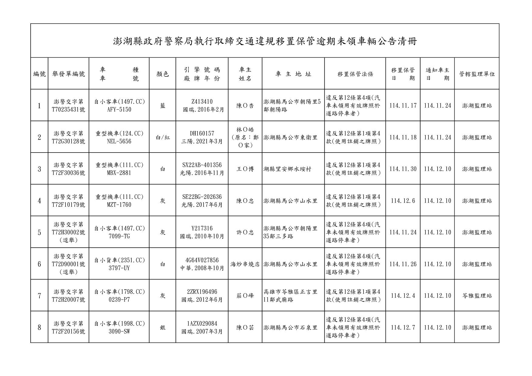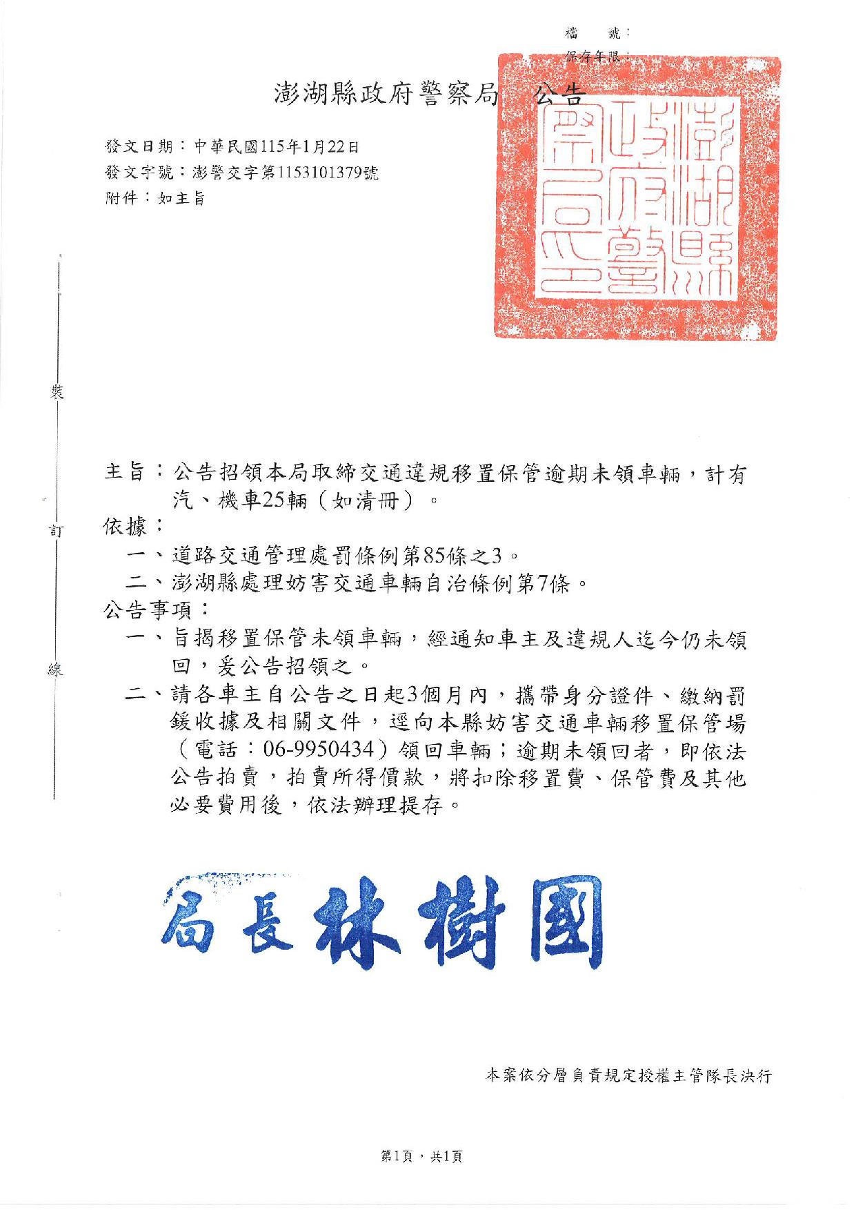 澎湖縣政府警察局1150123公告