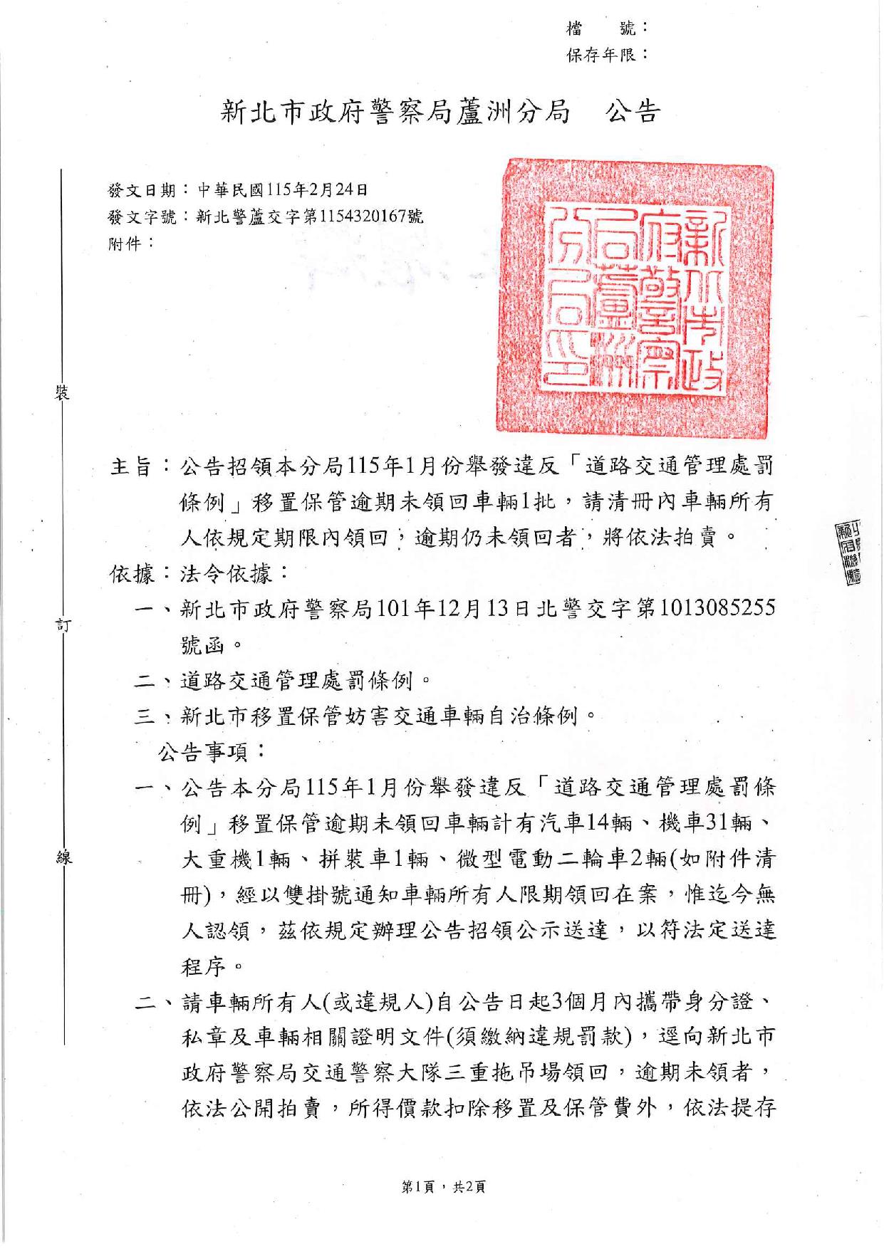 新北市政府警察局蘆洲分局1150224公告及清冊