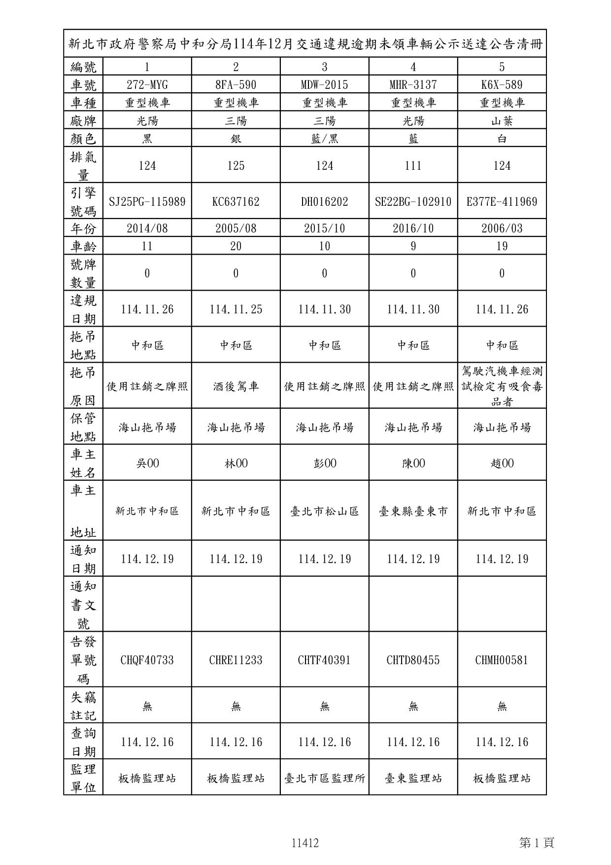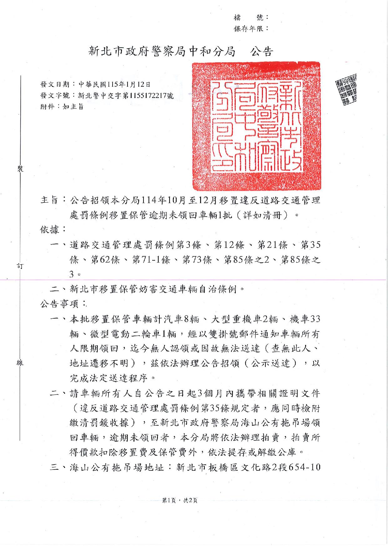 新北中和分局114年10月至12月移置違反道路交通管理處罰條例逾期未領回車輛公告