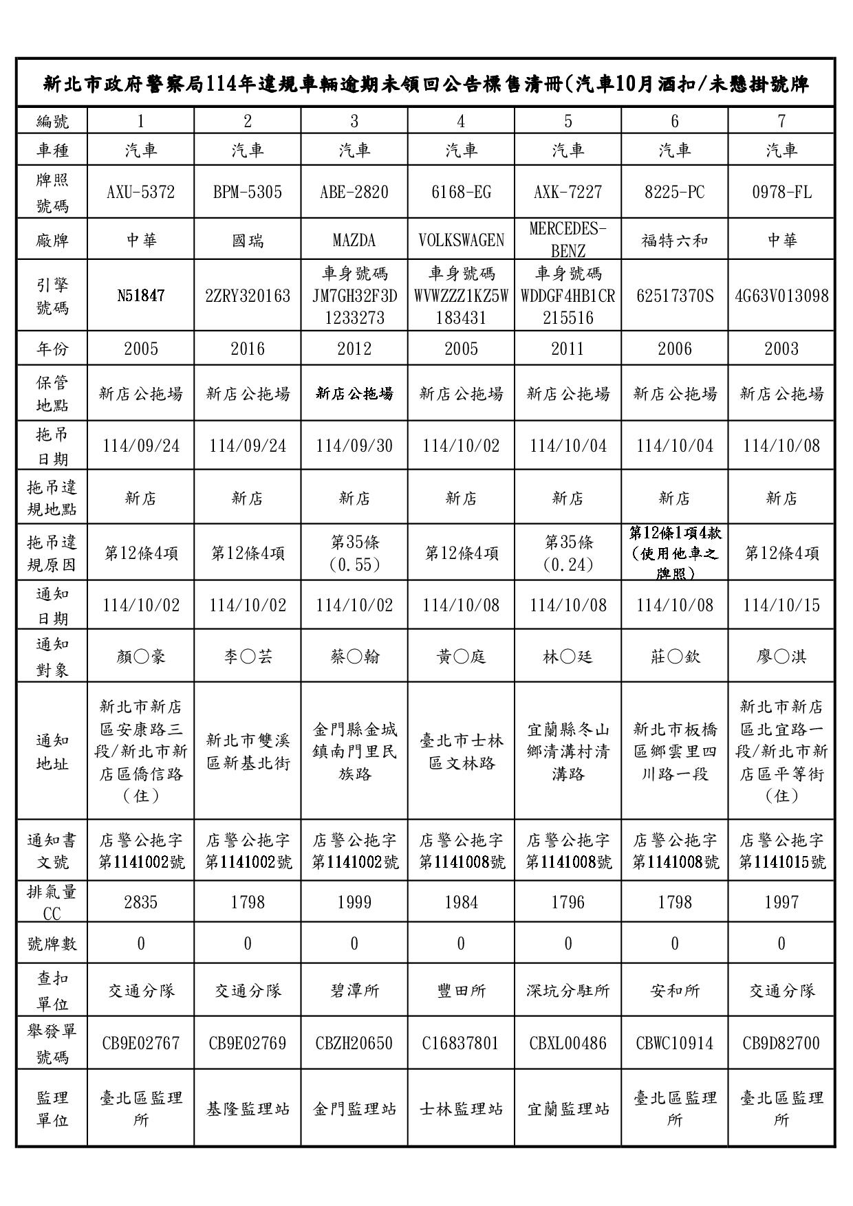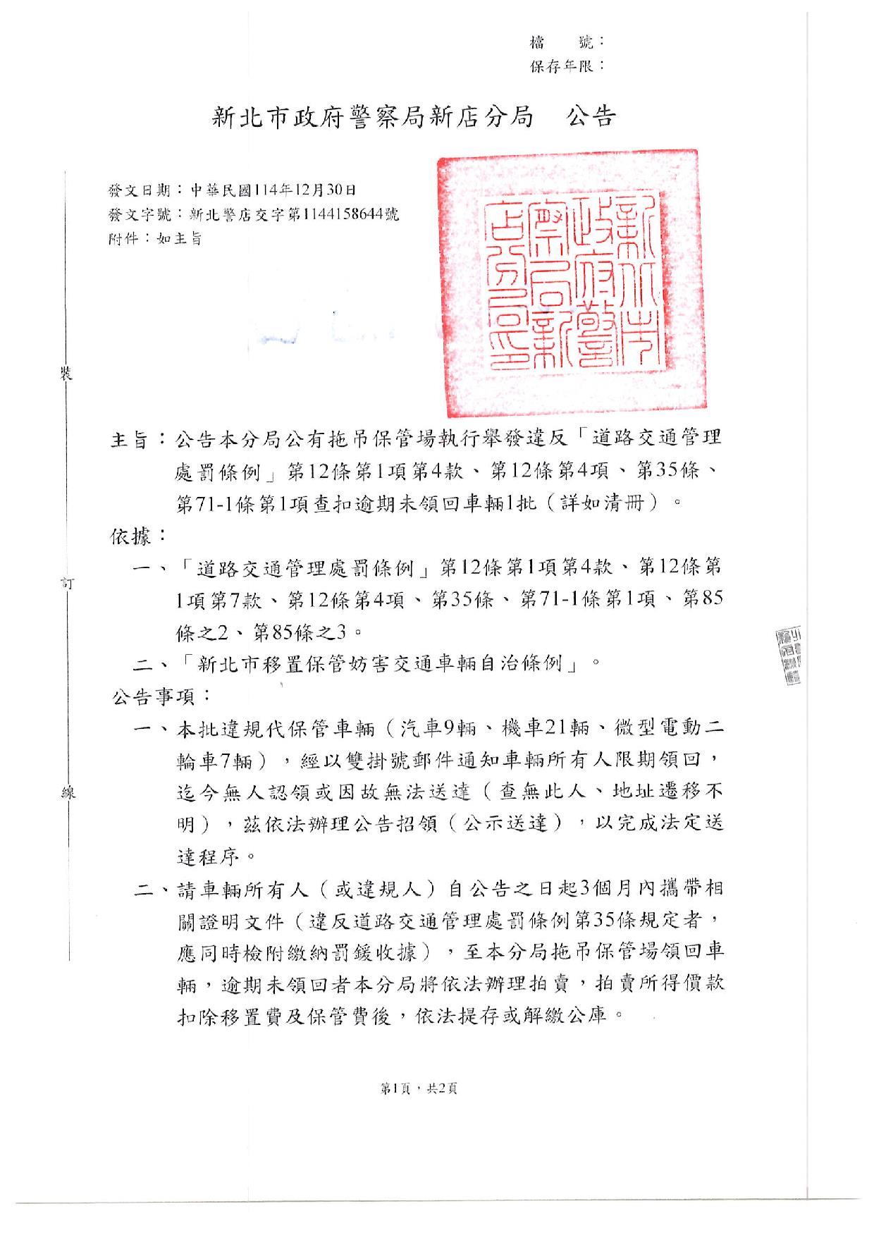 新北市政府警察局新店分局1141230公告