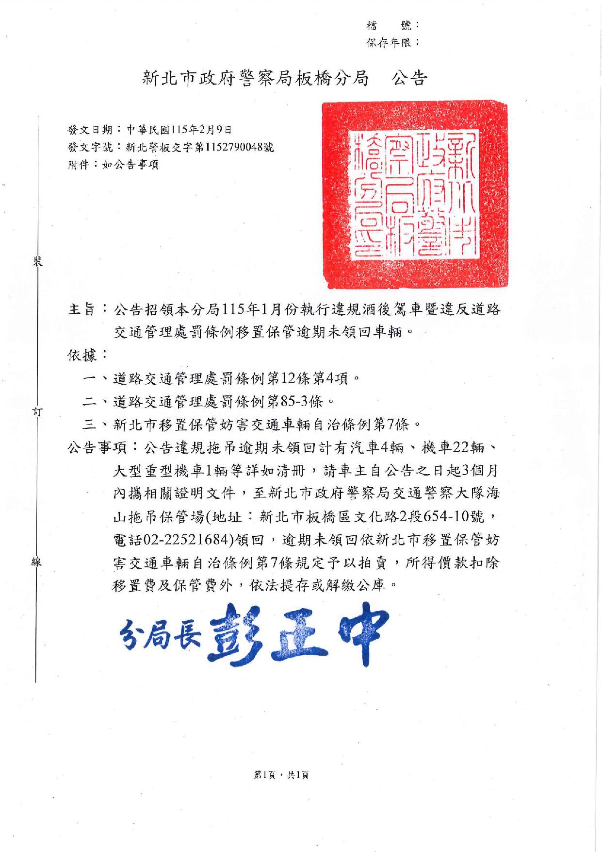 新北市政府警察局板橋分局1150210逾期未領公告(1150209-1152790048)