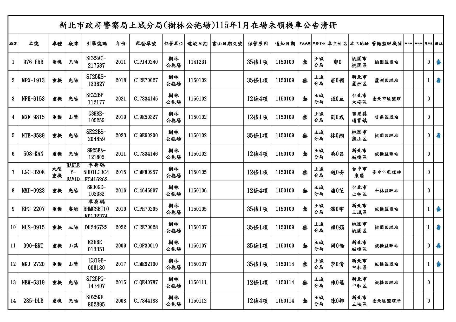 新北市政府警察局土城分局1150209公告