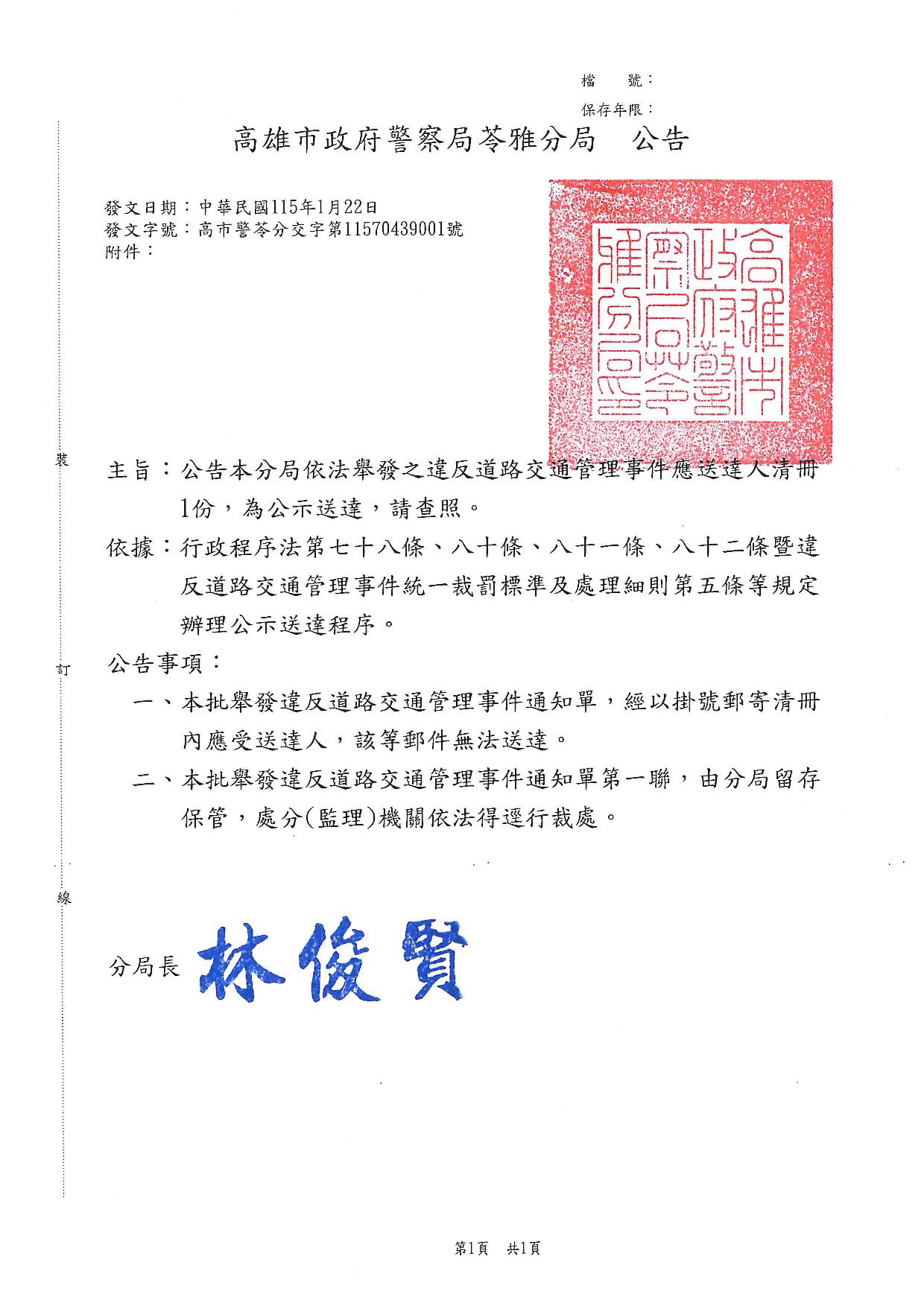 高雄市政府警察局苓雅分局1150122公告及清冊