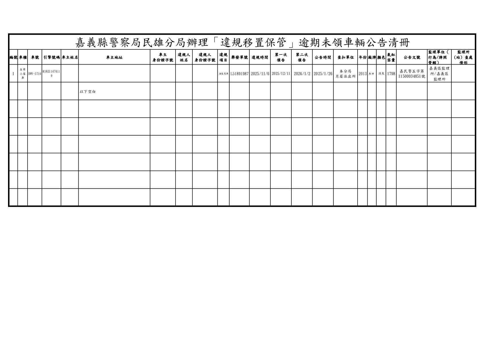 嘉義縣警察局民雄分局1150126公告