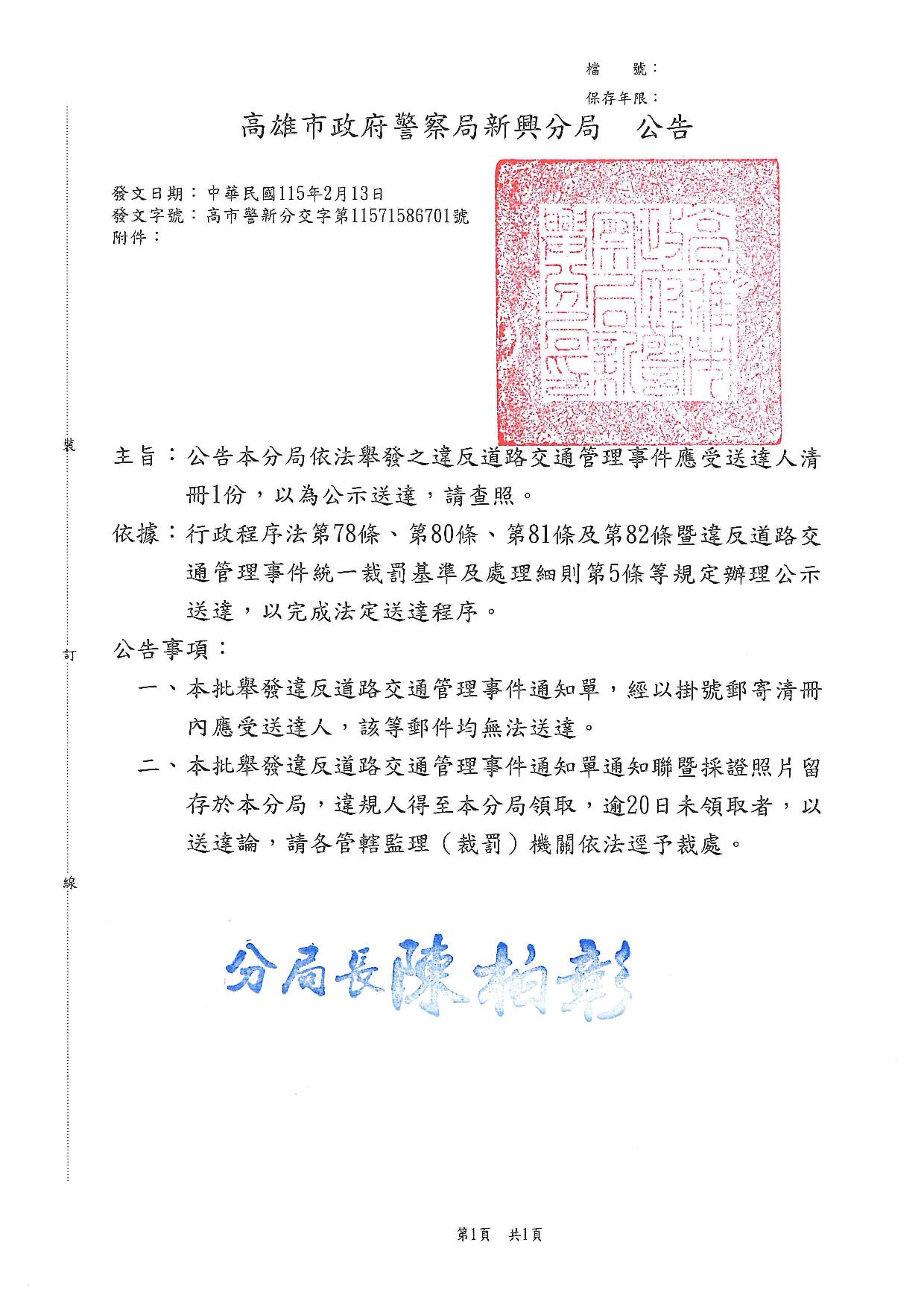 高雄市政府警察局新興分局1150213公告