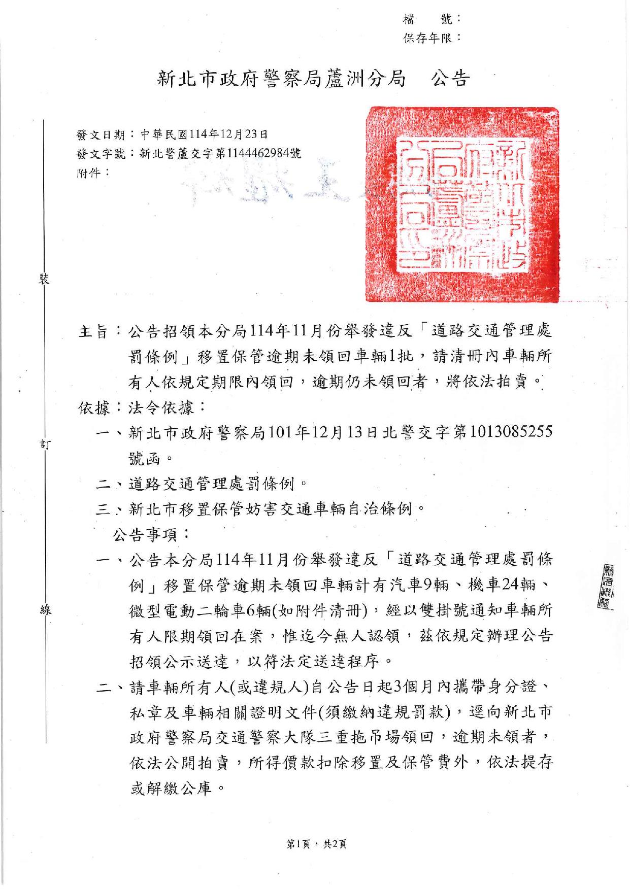 新北市政府警察局蘆洲分局公告