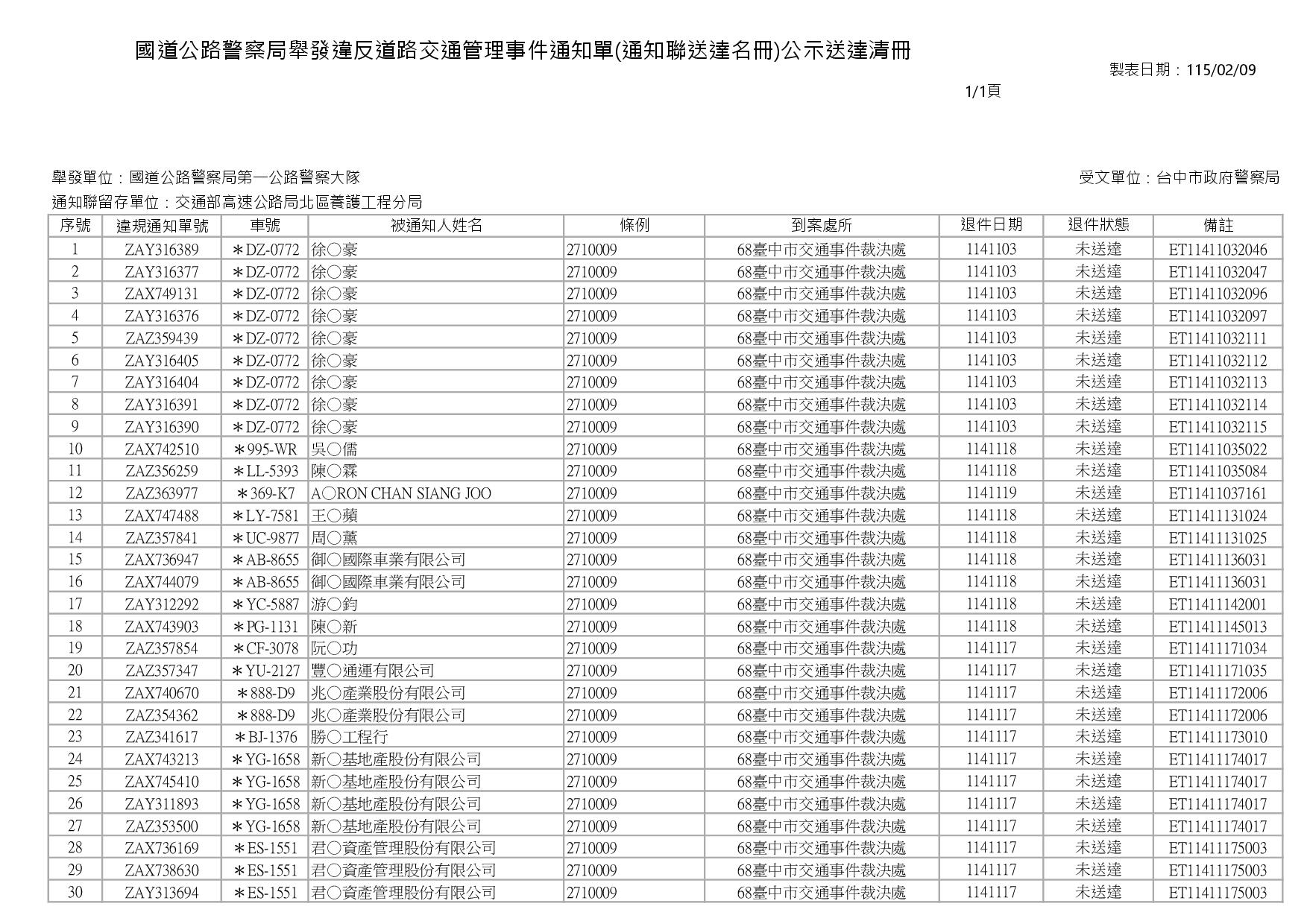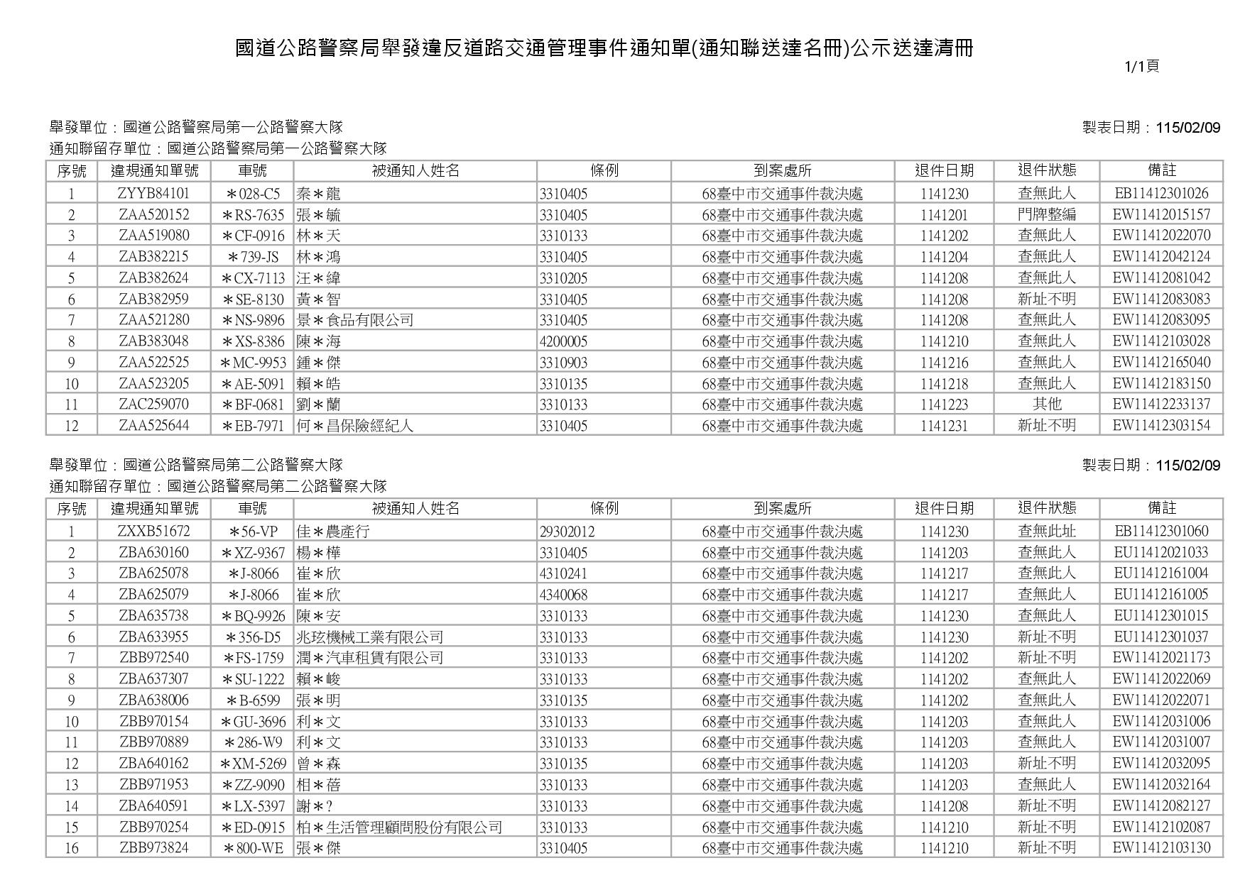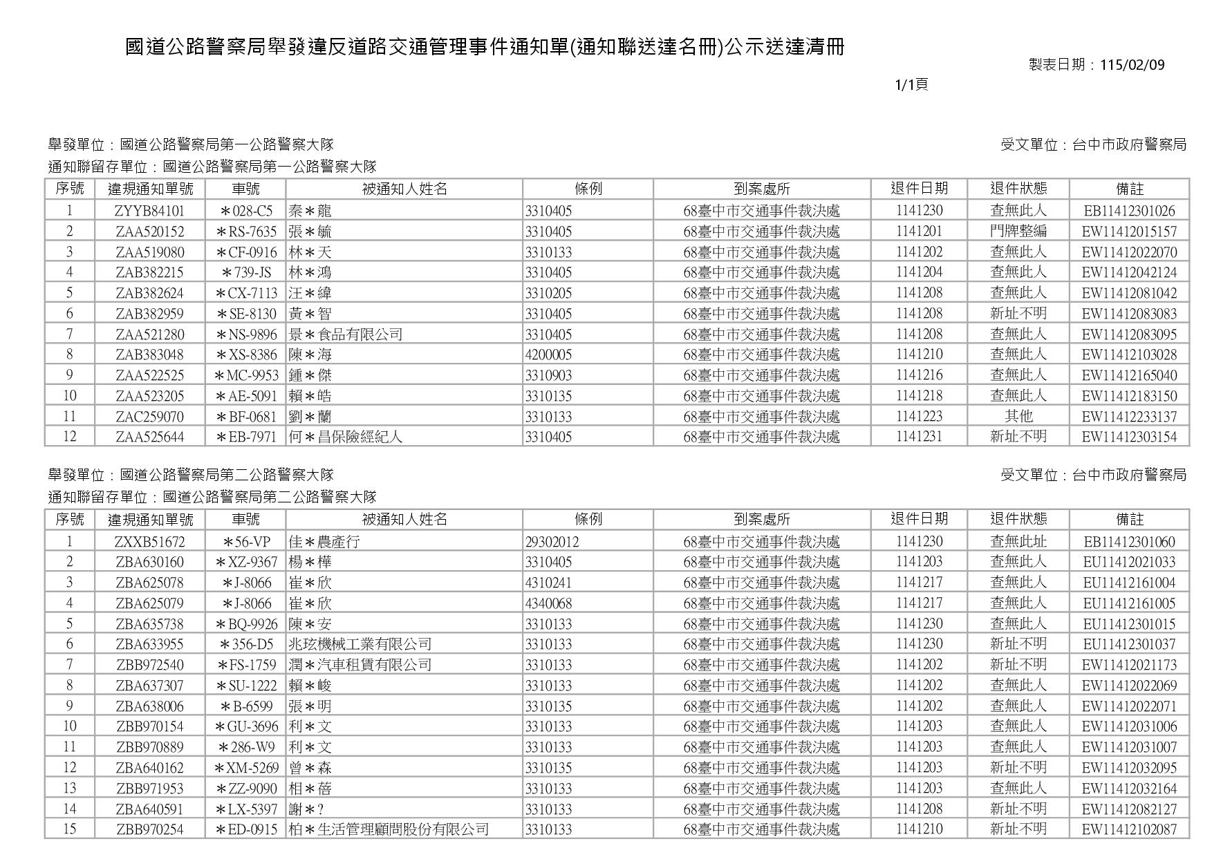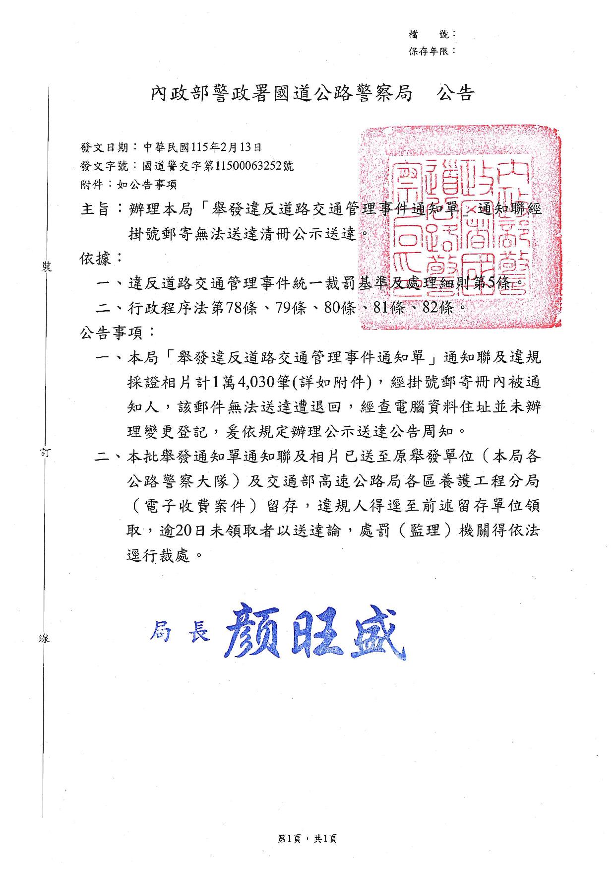 內政部警政署國道公路警察局1150213公告