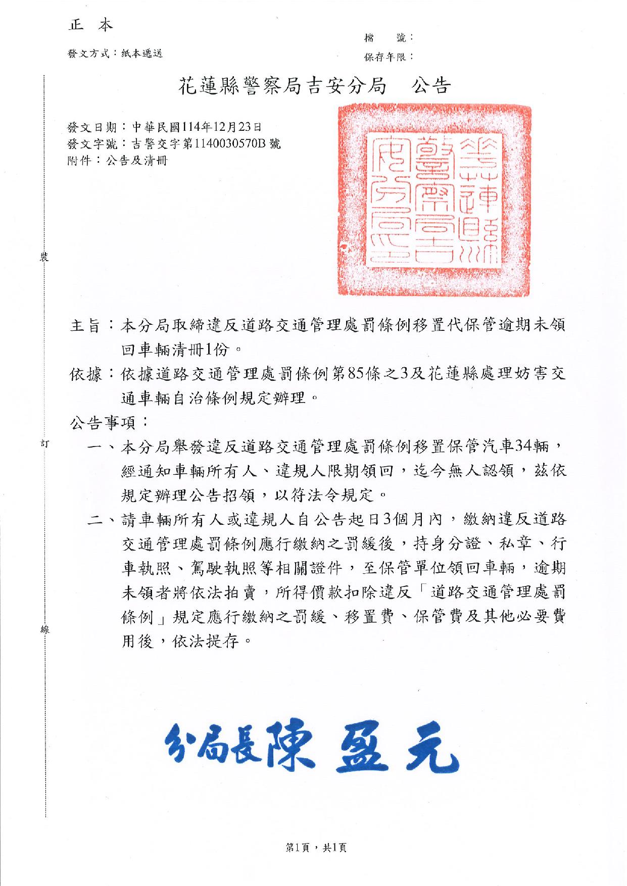 花蓮縣警察局吉安分局公告及清冊1141223