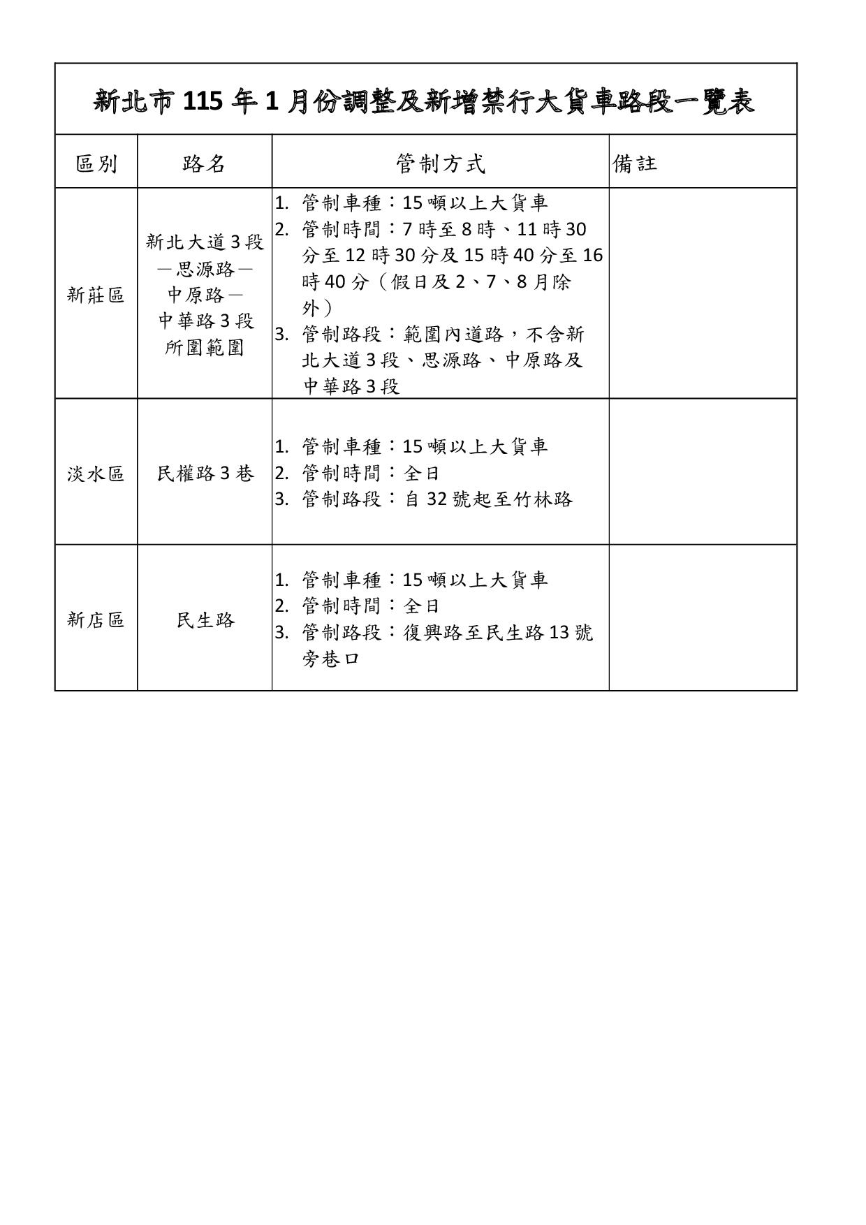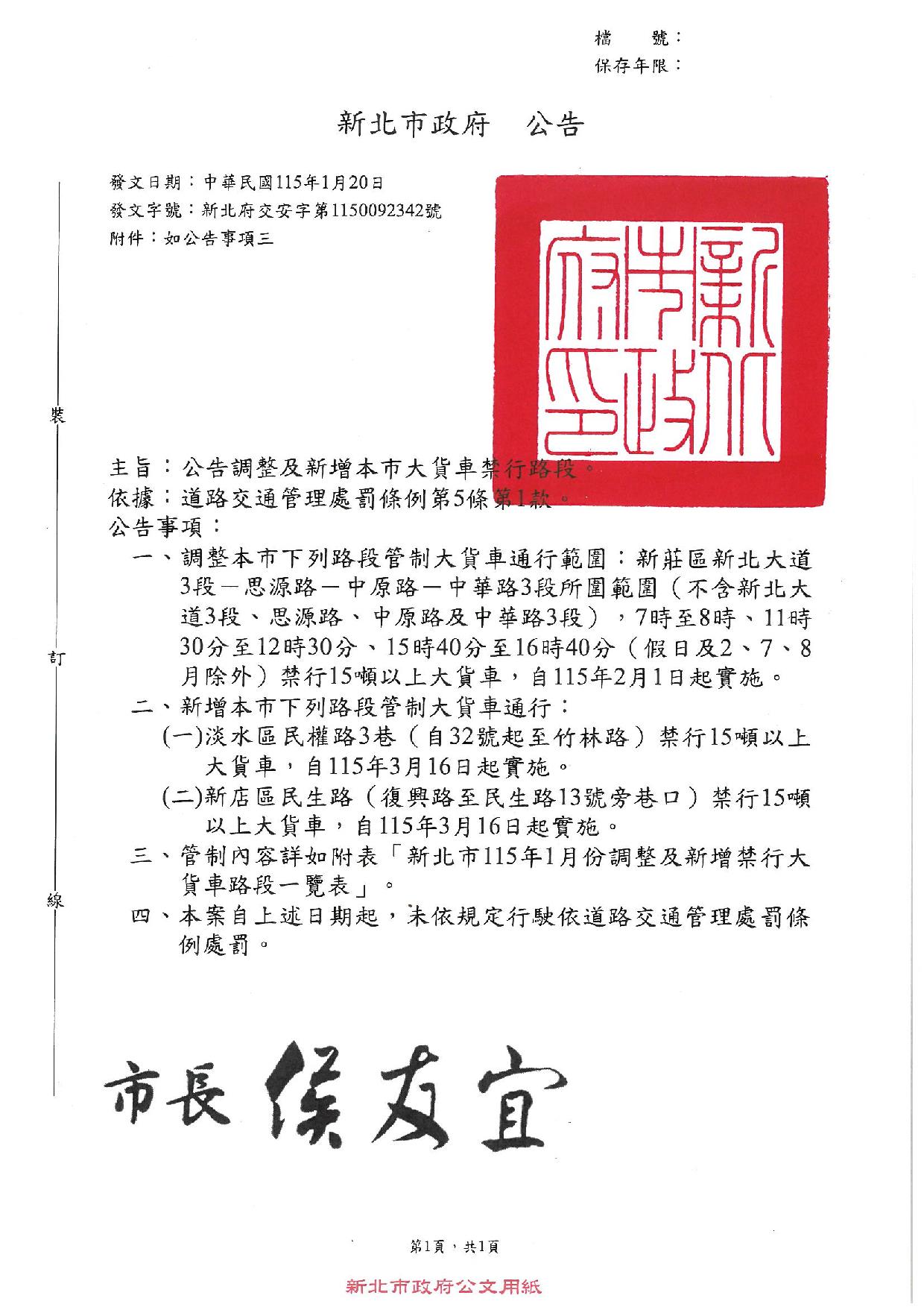 新北市1150123大貨車禁行路段公告
