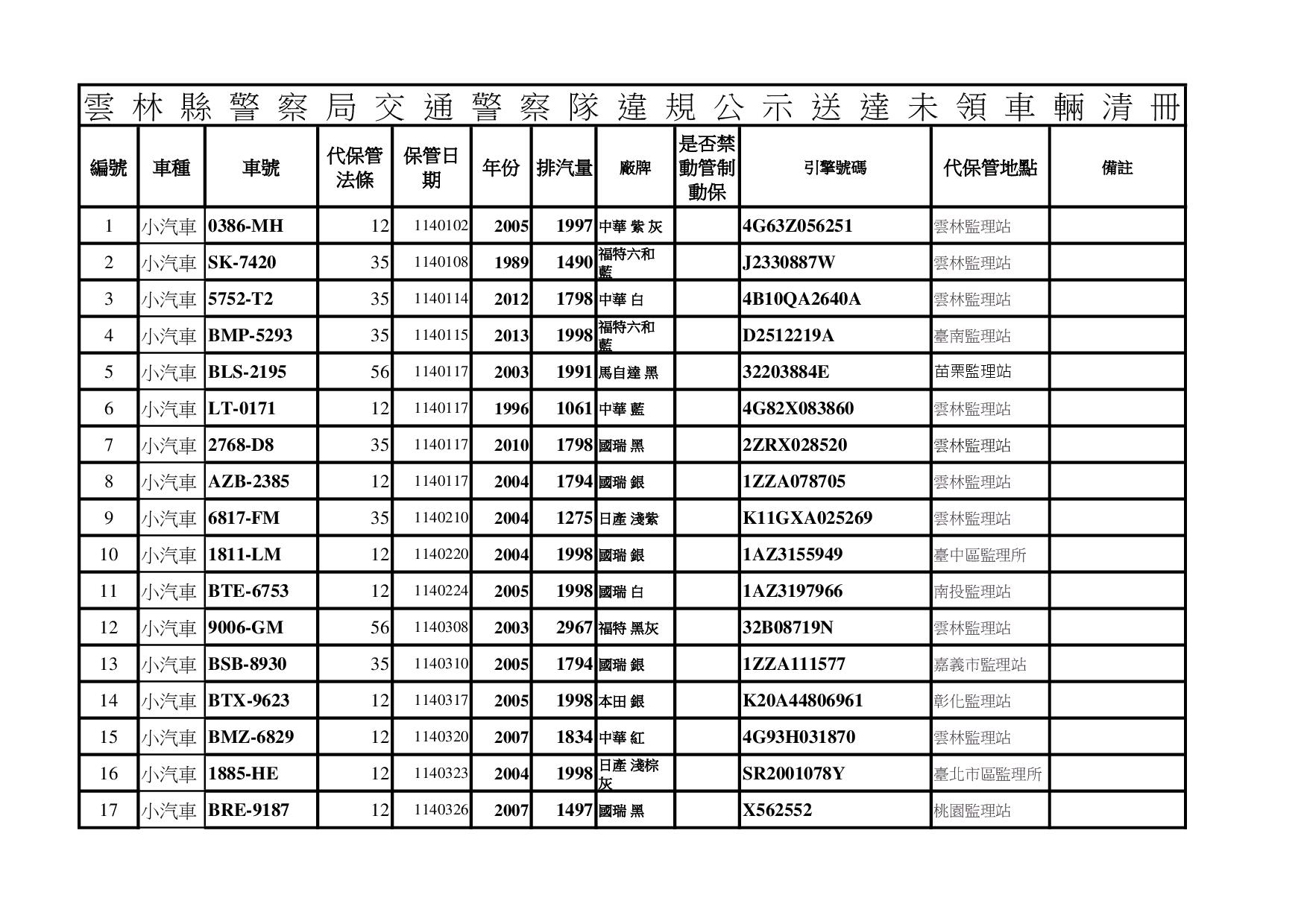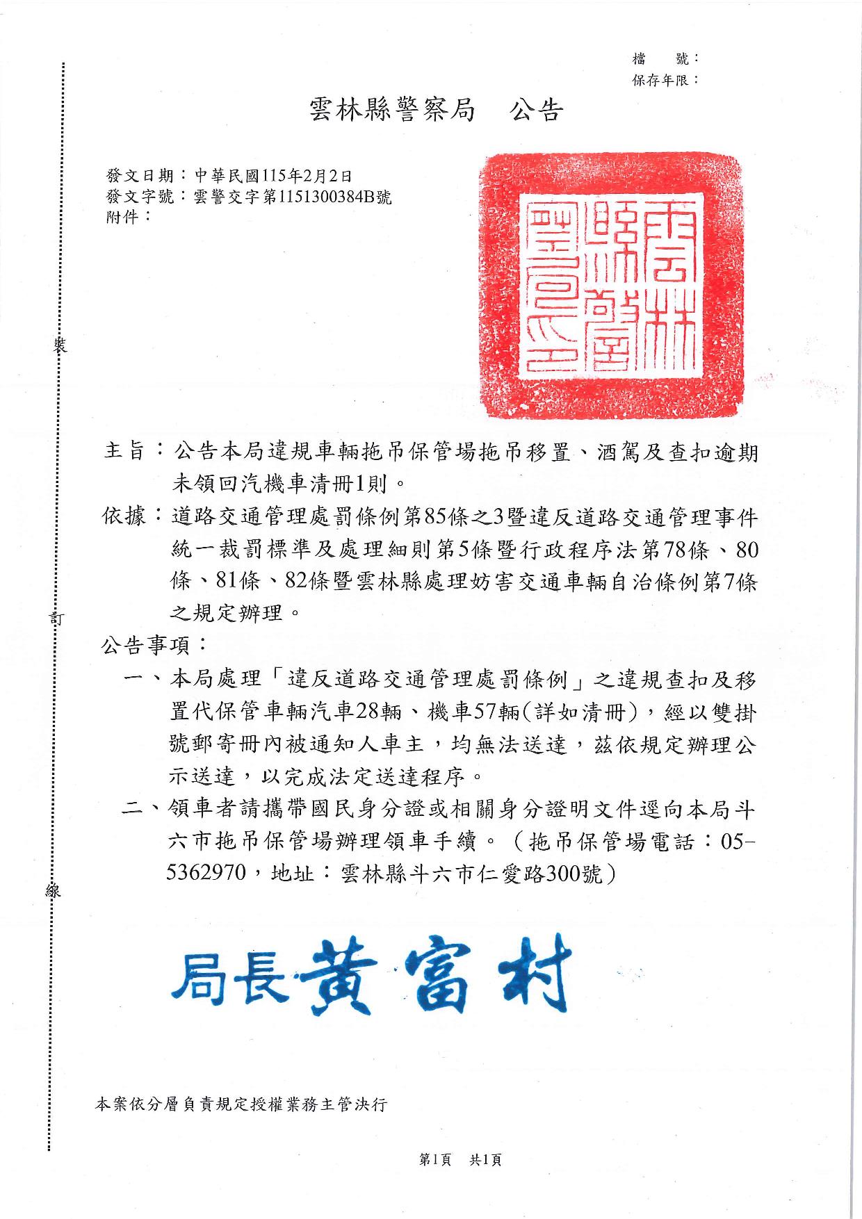雲林縣警察局1150202公告