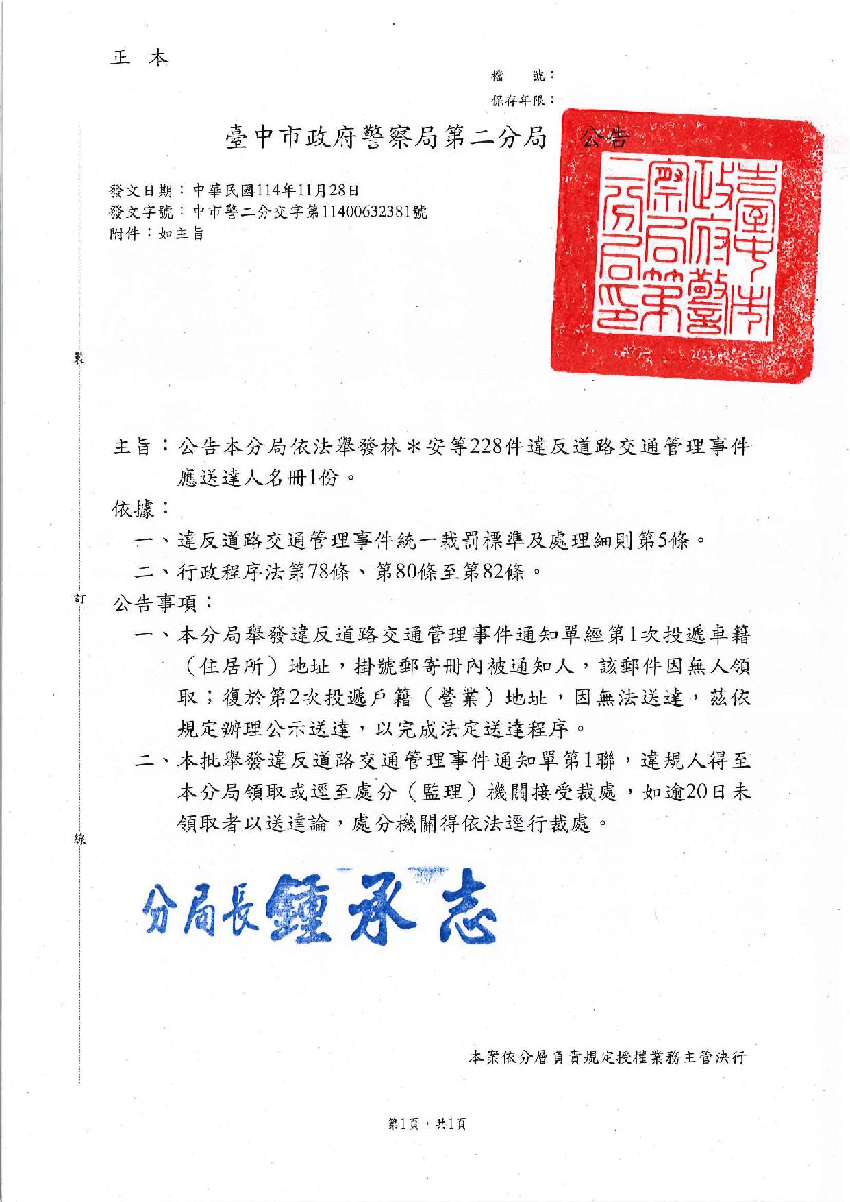 臺中市政府警察局第二分局公告