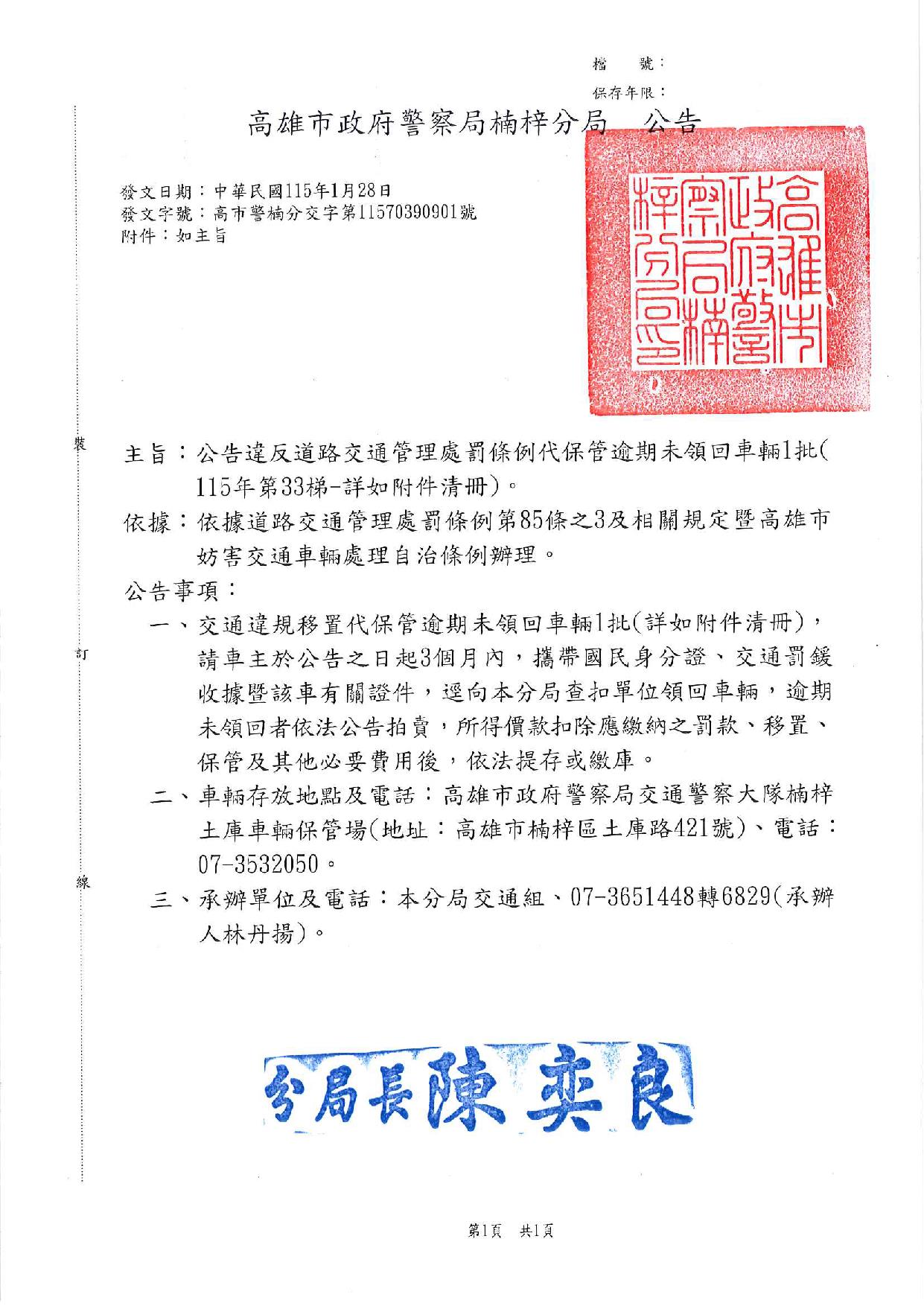 高雄市政府警察局楠梓分局1150128公告及清冊