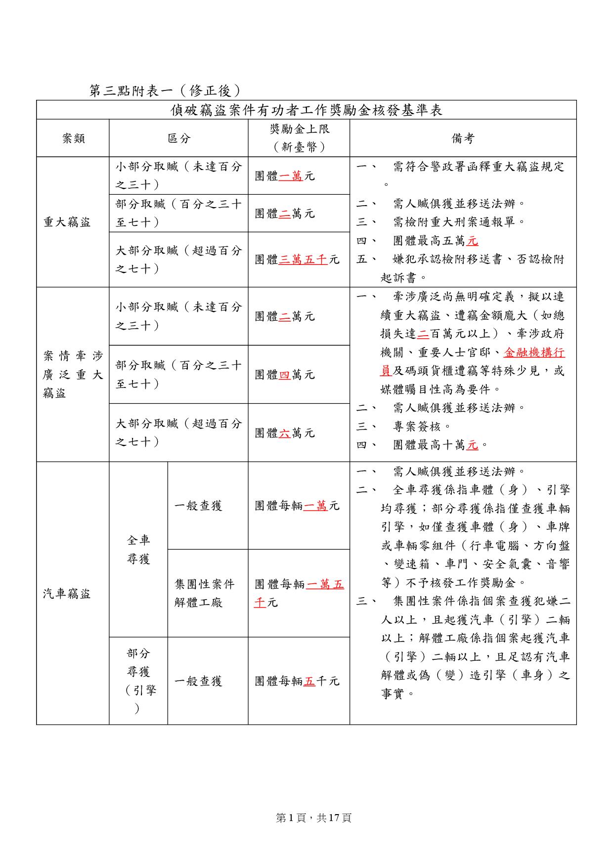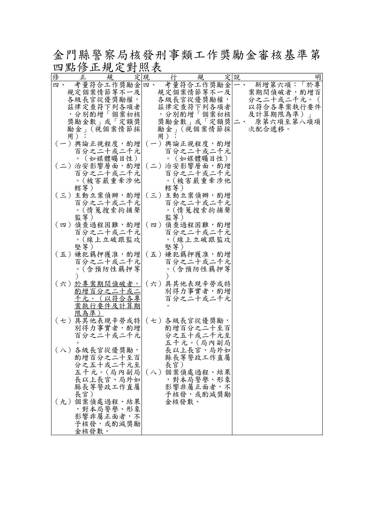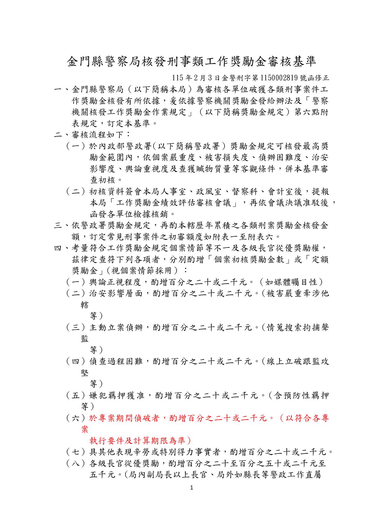 一、金門縣警察局(以下簡稱本局)為審核各單位破獲各類刑事案件工作獎勵金核發有所依據,爰依據警察機關獎勵金發給辦法及「警察機關核發工作獎勵金作業規定」(以下簡稱獎勵金規定)第六點附表規定,訂定本基準。 二、審核流程如下: (一)於內政部警政署(以下簡稱警政署)獎勵金規定可核發最高獎勵金範圍內,依個案嚴重度、被害損失度、偵辦困難度、治安影響度、輿論重視度及查獲贓物質量等客觀條件,併本基準審查初核。 (二)初核資料簽會本局人事室、政風室、督察科、會計室後,提報本局「工作獎勵金績效評估審核會議」,再依會議決議准駁後,函發各單位檢據核銷。 三、依警政署獎勵金規定,再酌本轄歷年累積之各類刑案獎勵金核發金額,訂定常見刑事案件之初審額度如附表一至附表六。 四、考量符合工作獎勵金規定個案情節等不一及各級長官從優獎勵權,茲律定查符下列各項者,分別酌增「個案初核獎勵金數」或「定額獎勵金」(視個案情節採用): (一)輿論正視程度,酌增百分之二十或二千元。(如媒體矚目性) (二)治安影響層面,酌增百分之二十或二千元。(被害嚴重牽涉他轄等) (三)主動立案偵辦,酌增百分之二十或二千元。(情蒐搜索拘捕聲監等) (四)偵查過程困難,酌增百分之二十或二千元。(線上立破跟監攻堅等) (五)嫌犯羈押獲准,酌增百分之二十或二千元。(含預防性羈押等) (六)於專案期間偵破者,酌增百分之二十或二千元。(以符合各專案執行要件及計算期限為準) (七)具其他表現辛勞或特別得力事實者,酌增百分之二十或二千元。 (八)各級長官從優獎勵,酌增百分之二十至百分之五十或二千元至五千元。(局內副局長以上長官、局外如縣長等警政工作直屬長官) (九)個案偵處過程、結果,對本局警譽、形象影響非屬正面者,不予核發,或酌減獎勵金核發數。 五、本獎勵金之核發,應於每年度預算經費內支應,經費有限或不足時,得視經費執行情形酌減或不予發給。